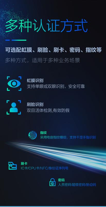 系统可将已登记的虹膜、人脸库信息与采集到的虹膜信息、人脸信息进行比对验证,识别成功后自动记录保存可作为考勤打卡,对于该门禁点的授权人员在识别通过后自动开门并语音提示,比对失败情况下,系统自动报警通知相关人员。