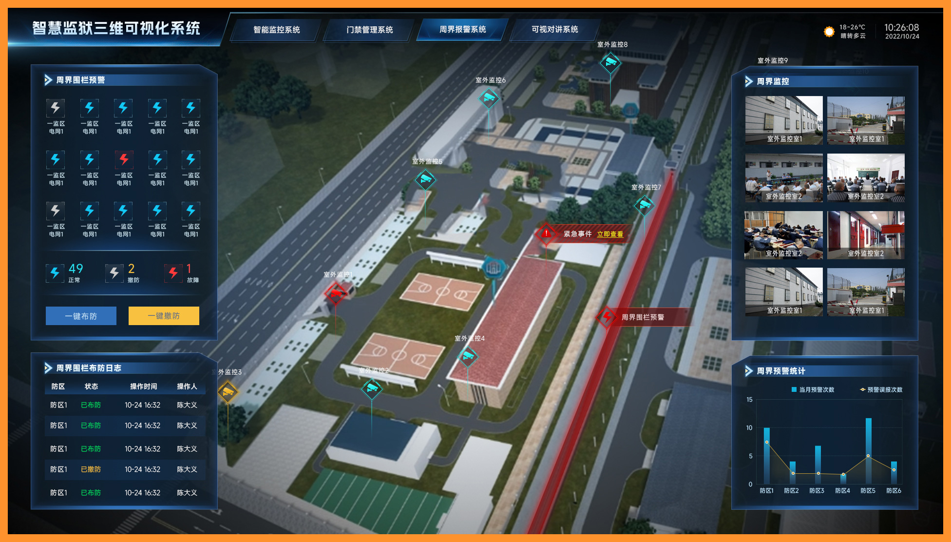 全域无死角管控,安全零漏洞:监控、周界、门禁、报警全系统联动,覆盖监狱所有区域,主动预警各类安全隐患,替代人工被动巡查,彻底堵塞传统人工管控漏洞,全方位筑牢监管安全防线。