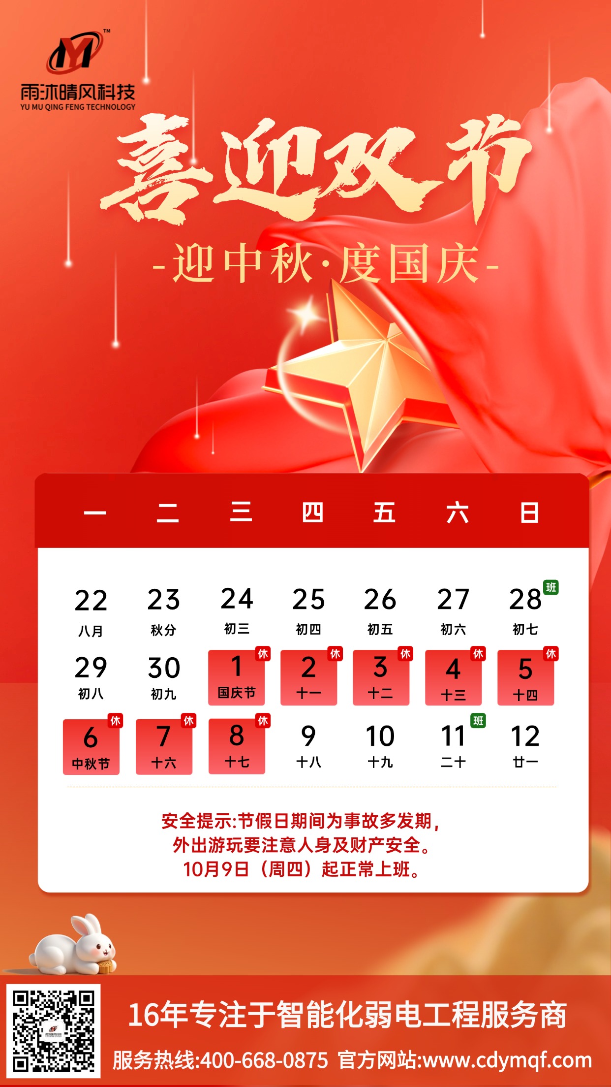 成都弱电工程公司雨沐晴风科技,根据国务院办公厅发布的《关于2025年部分节假日安排的通知》,今年国庆节与中秋节将“喜相逢”,合并放假调休共8天!10月1日(周三)至8日(周三)放假调休,共8天。9月28日(周日)、10月11日(周六)上班。